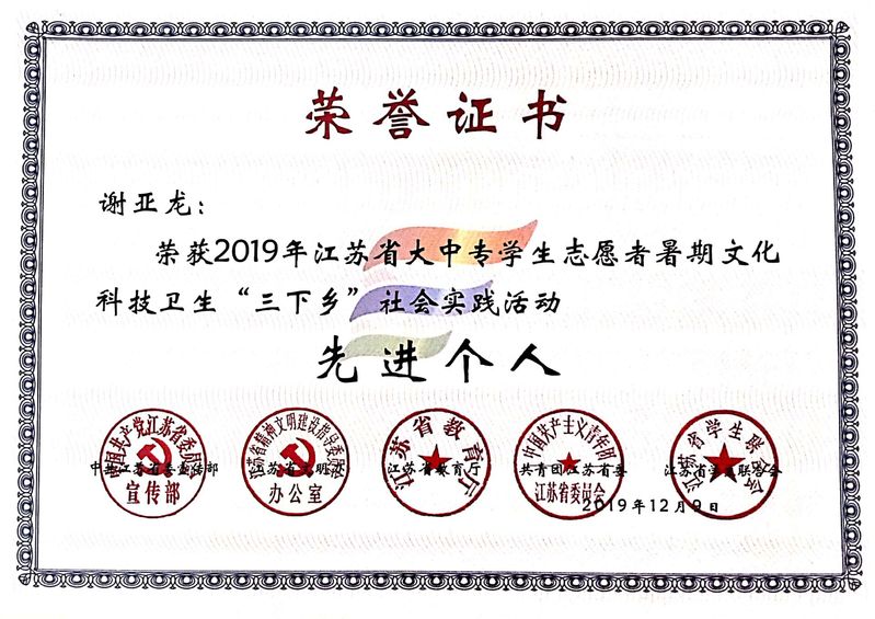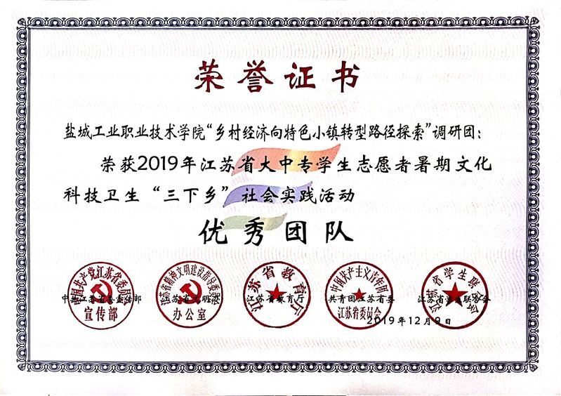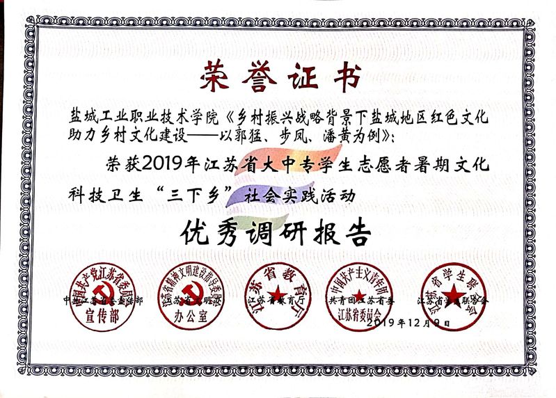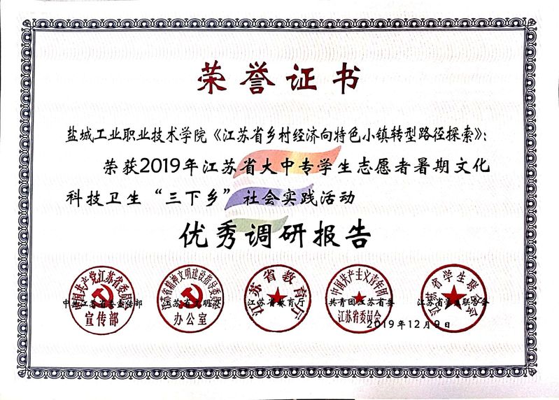 近日,省委宣传部、省文明办、省教育厅、团省委、省学联联合发文表彰了2019年江苏省大中专学生志愿者暑期“三下乡”社会实践活动优秀团队、先进工作者、先进个人以及优秀调研报告,我校荣获多项表彰。我校《江苏省乡村经济向特色小镇转型路径探索——以盱眙县为例》实践团队荣获优秀团队荣誉称号;经贸管理学院团总支书记薛凌云被评为省级先进工作者;汽车工程学院谢亚龙同学被评为省先进个人;建筑工程学院颜振亚老师指导的《乡村振兴战略背景下盐城地区红色文化助力乡村文化建设——以实地调研郭猛、步凤、潘黄三镇为例》和艺术设计学院丁鑫老师指导的《江苏省乡村经济向特色小镇转型路径探索》被评为省优秀调研报告。