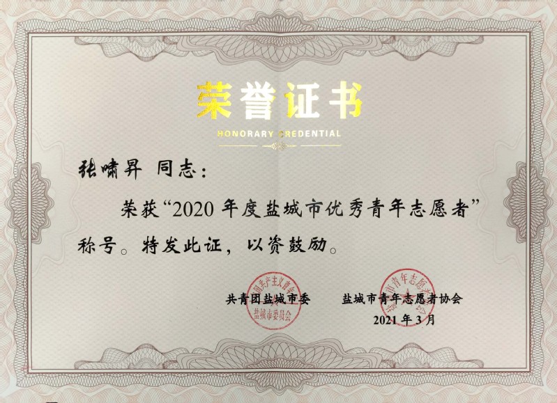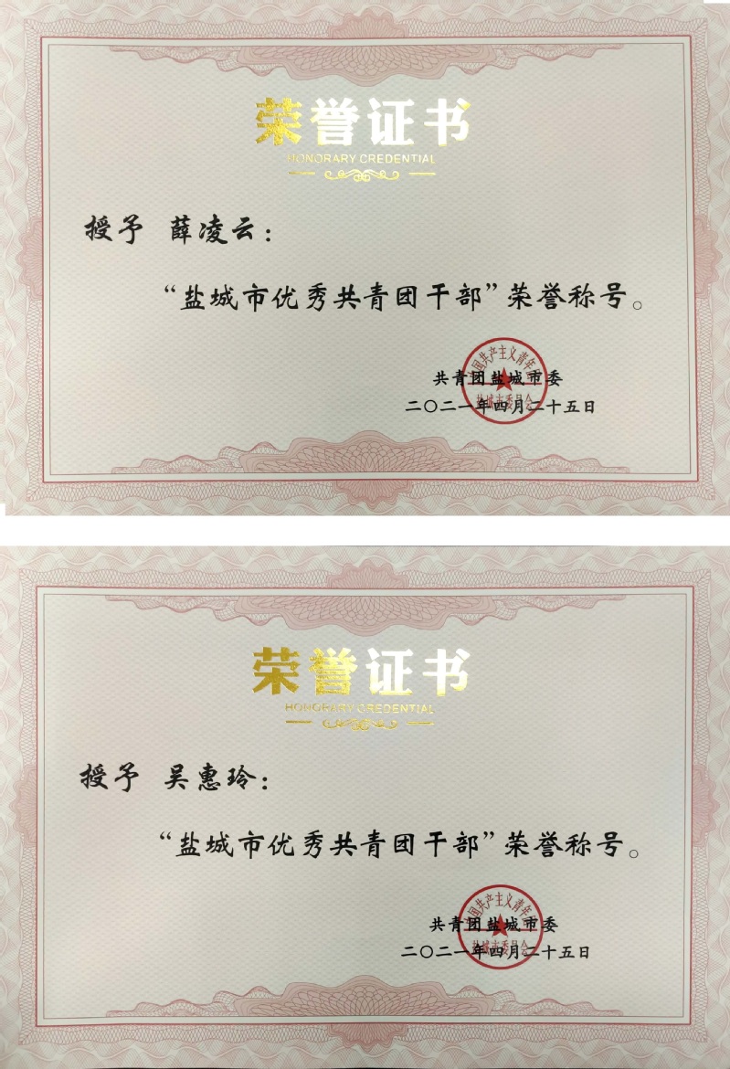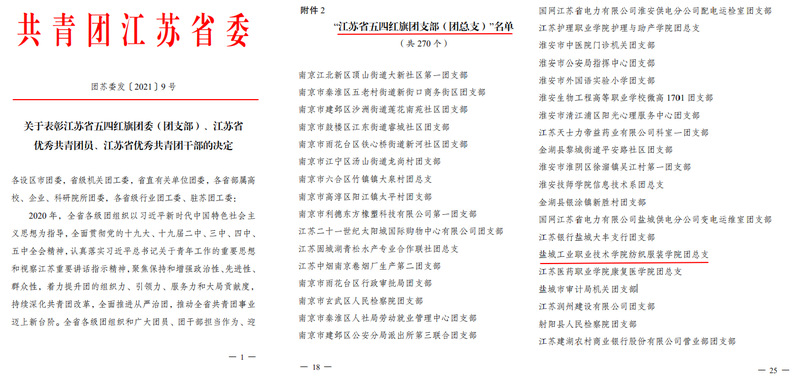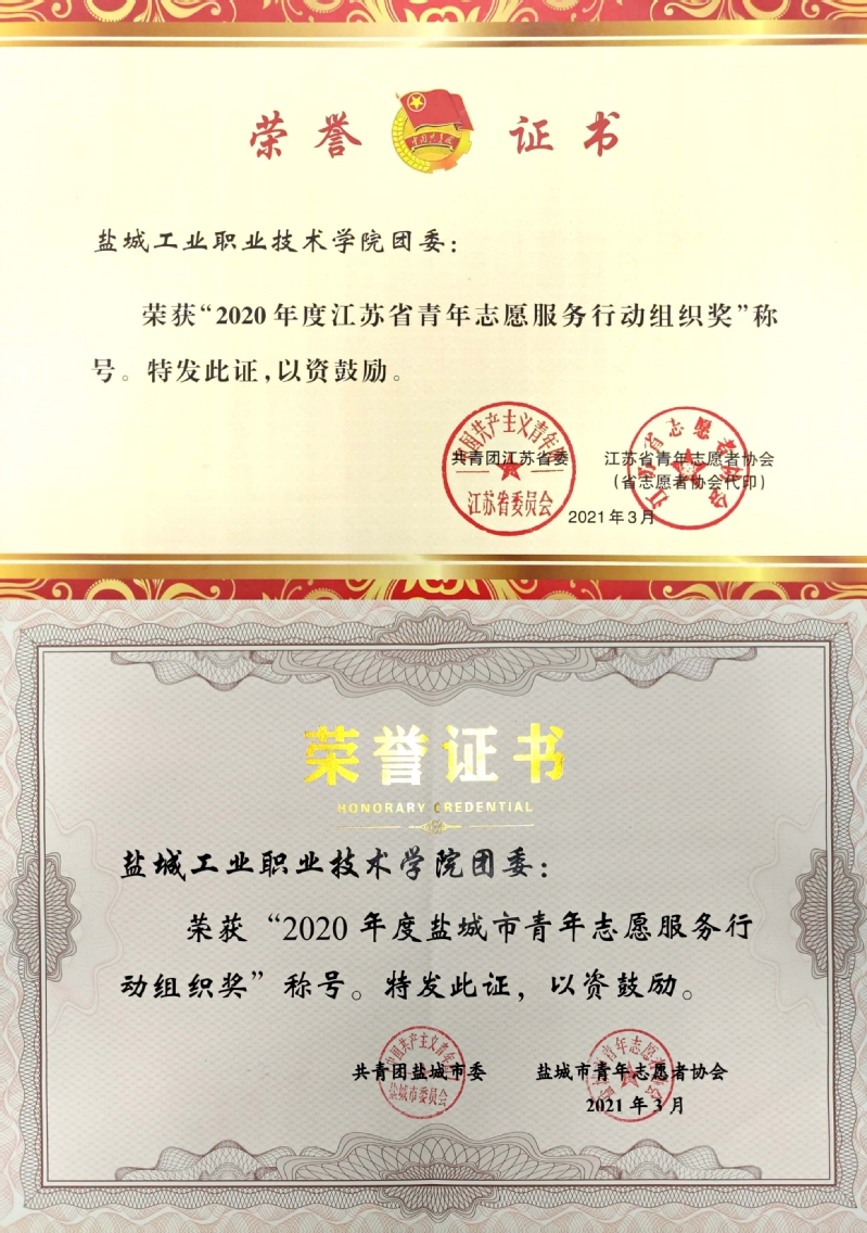 近日,共青团江苏省委、共青团盐城市委下发文件,对2020年度共青团工作进行了表彰,我校团委获“江苏省青年志愿服务行动组织奖”“盐城市青年志愿服务行动组织奖”等荣誉称号;纺织服装学院团总支获“江苏省五四红旗团总支”荣誉称号;经贸管理学院副院长周荣虎获“盐城市新长征突击手”荣誉称号;经贸管理学院团总支书记薛凌云,盐城团市委挂职团干部、汽车与交通学院辅导员吴惠玲获“盐城市优秀共青团干部”荣誉称号;建筑工程学院蔡闯闯、汽车与交通学院杨陈陈同学获“盐城市优秀共青团员”荣誉称号;校青年志愿者协会负责人张啸昇同学等获“盐城市优秀青年志愿者”称号。