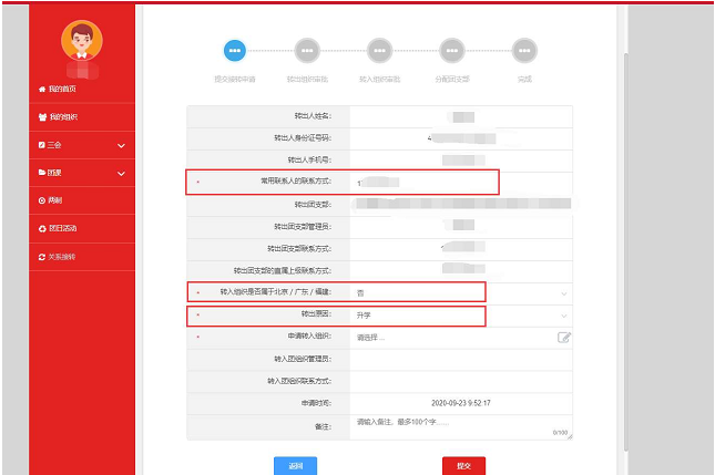 ③点击提交,完成转入申请,等待相应组织审核接收。