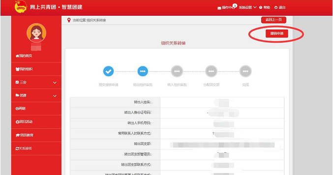 ④如转错组织或信息填写错误,可进入关系接转页面,在“我的组织关系转接历史”一栏,选择查看当前的申请,点击“撤销申请”,即可重新发起转接申请。