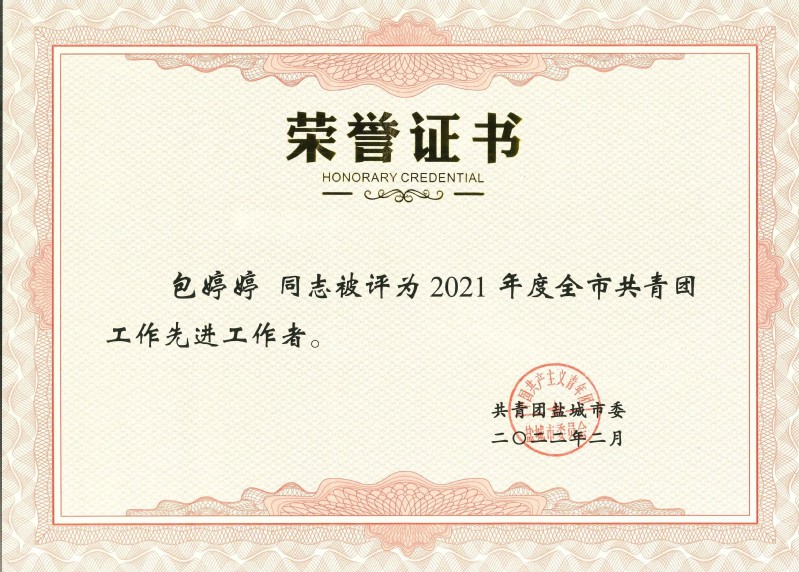 近日,共青团盐城市委员会八届八次全体(扩大)会议胜利召开,会议传达学习了团十八届六中全会和团省委十五届七次全会精神,并表彰了2021年度全市共青团工作先进单位和先进工作者。学校团委被评为2021年度全市共青团工作“综合先进单位”,团委书记包婷婷被评为“先进工作者”。