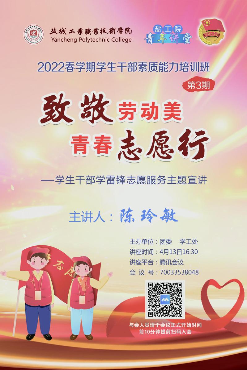 4月13日,我校2022年春学期学生干部素质能力培训班第三期专题讲座“致敬劳动美青春志愿行——学生干部学雷锋志愿服务主题宣讲”在腾讯会议平台举行,校团委兼职副书记陈玲敏应邀主讲,全校200余名学生干部观看了讲座直播。
