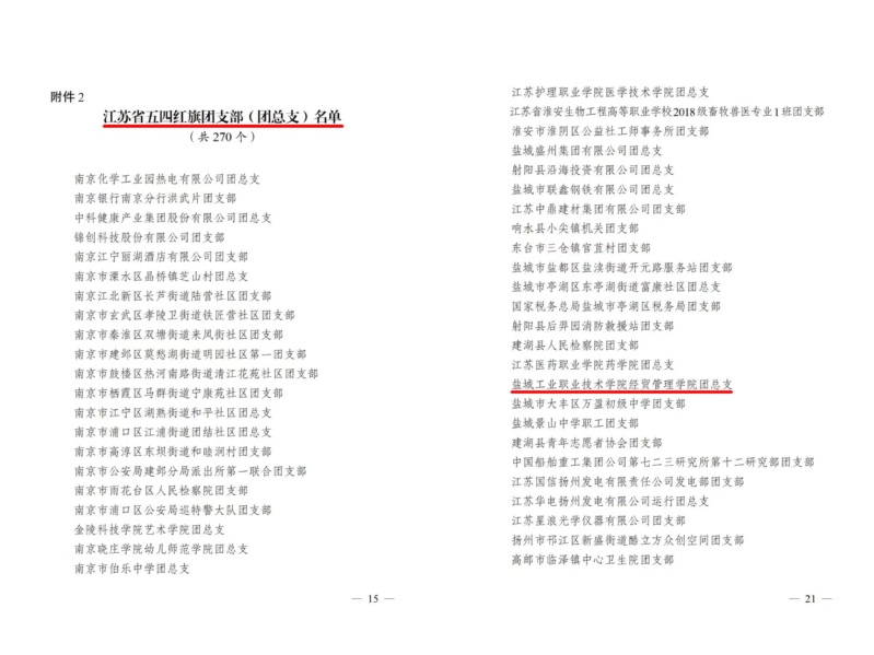 近日,共青团江苏省委、共青团盐城市委下发文件,对2021年度共青团工作进行了表彰,学校多个团组织、团学骨干荣获省、市级2021年度“两红两优” 等多项荣誉表彰。学校团委获“盐城市五四红旗团委”荣誉称号;经贸管理学院团总支获“江苏省五四红旗团总支”荣誉称号;汽车与交通学院党总支副书记、副院长陈安柱获“盐城市新长征突击手”荣誉称号;校团委兼职副书记、纺织服装学院团总支书记陈玲敏获“盐城市优秀共青团干部”荣誉称号;纺织服装学院高源同学、智能制造学院李景同学获“盐城市优秀共青团员”荣誉称号。