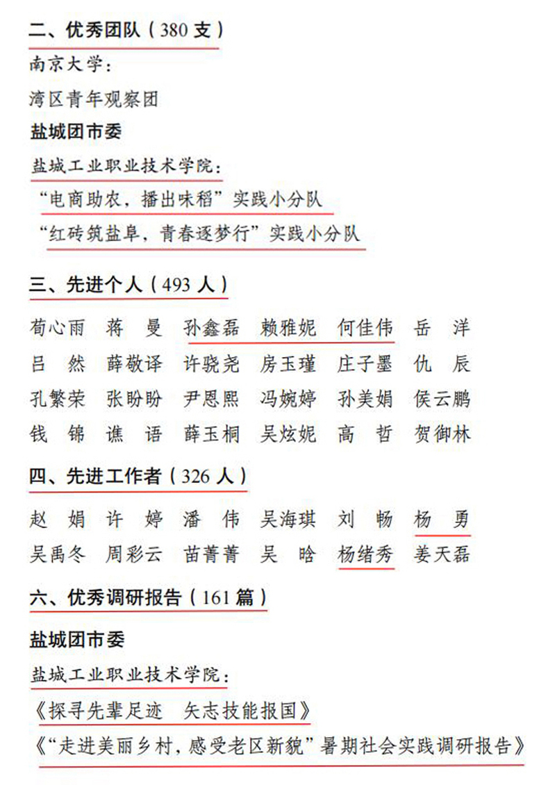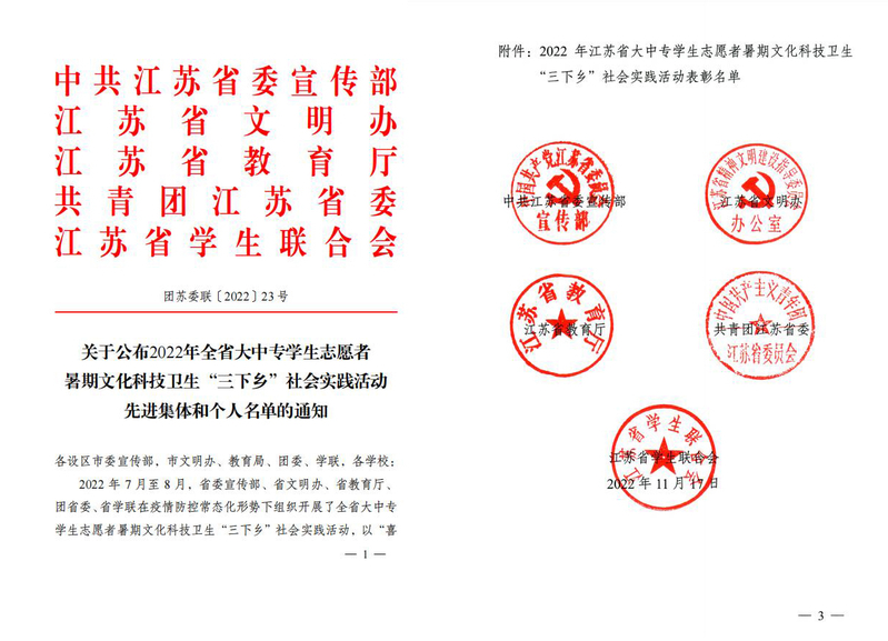 近日,省委宣传部、省文明办、省教育厅、团省委、省学联联合下发《关于公布2022年全省大中专学生志愿者暑期文化科技卫生“三下乡”社会实践活动先进集体和个人名单的通知》(团苏委联〔2022〕23 号)文件,表彰了2022年江苏省大中专学生志愿者暑期“三下乡”社会实践活动优秀团队、先进工作者、先进个人以及优秀调研报告,学校荣获多项表彰。经贸管理学院“电商助农,播出味稻”实践小分队、药品与健康学院“红砖筑盐阜,青春逐梦行”实践小分队两个实践团队荣获省级优秀团队荣誉称号;药品与健康学院党总支书记杨勇、智能制造学院杨绪秀老师被评为省级先进工作者;经贸管理学院孙鑫磊同学、汽车与交通学院何佳伟同学、药品与健康学院赖雅妮同学被评为省先进个人;建筑工程学院王静老师指导的《探寻先辈足迹 矢志技能报国》和顾洋老师指导的《“走进美丽乡村,感受老区新貌”暑期社会实践调研报告》被评为省优秀调研报告。