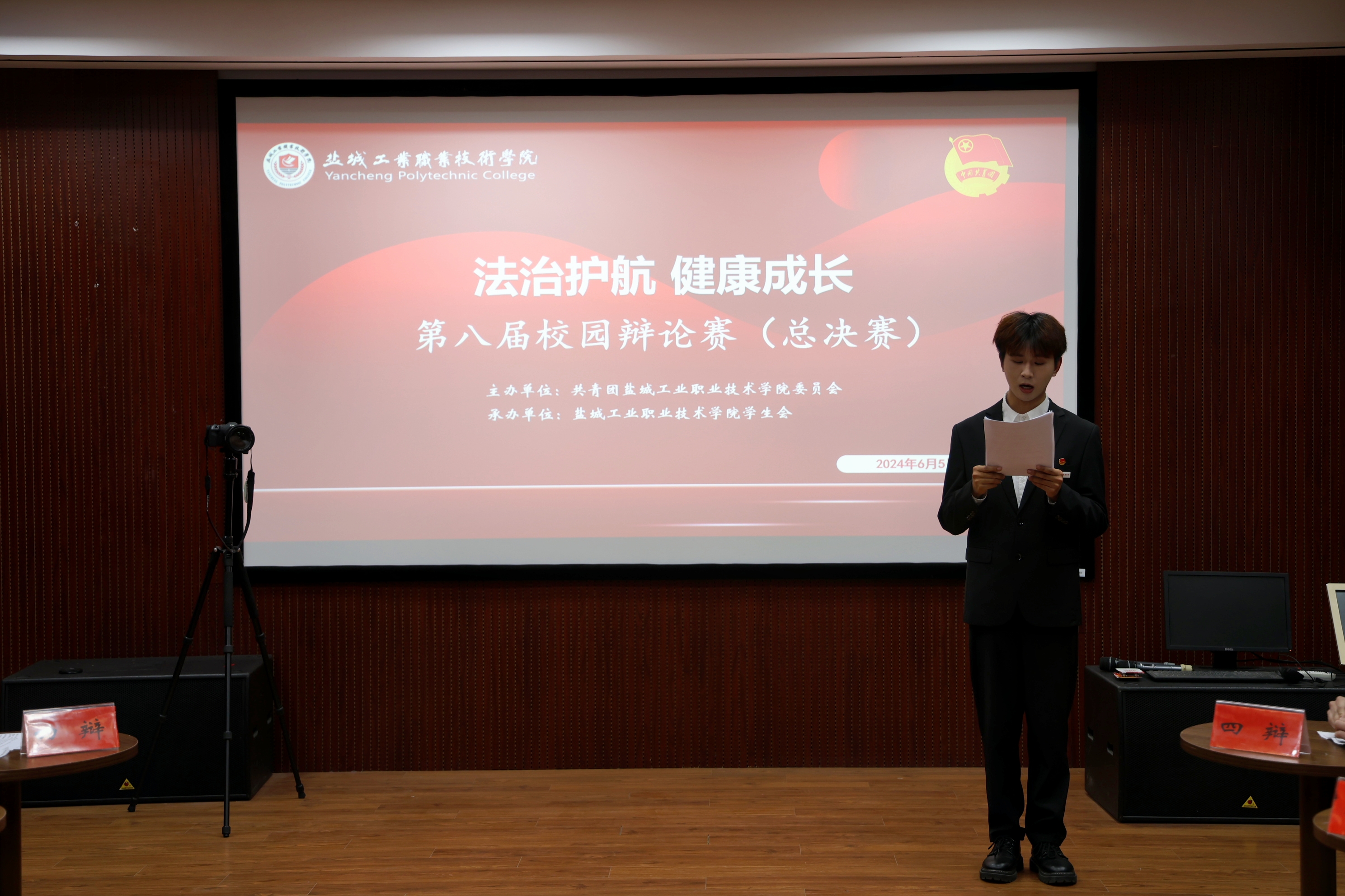 本届校园辩论赛历时半个月,辩题围绕法治教育、社会现象、青年发展等热点问题进行设计。经过二级学院初赛、校级复赛、半决赛的精彩角逐,最终,艺术与设计学院代表队、汽车与交通学院代表队争夺季军席位;校学生会代表队、校自律会代表队晋级冠亚军决赛。本次辩论赛共分为开篇立论、攻辩、自由辩论、总结陈词四个环节,晋级四强的各支代表队赛前都做好了充分准备。