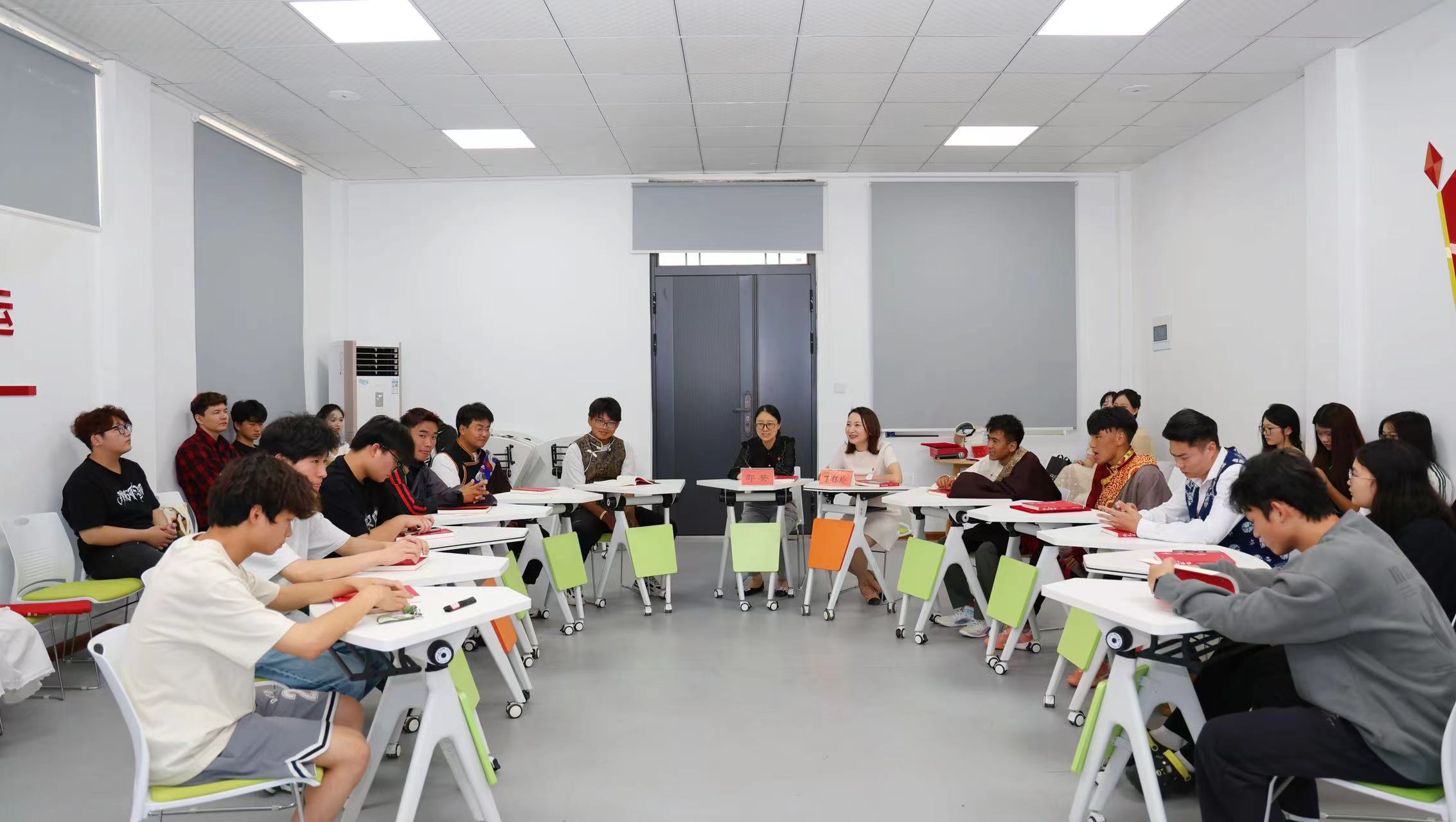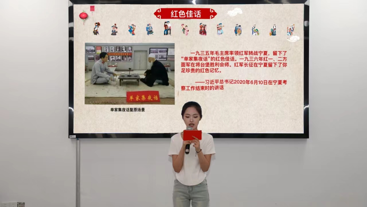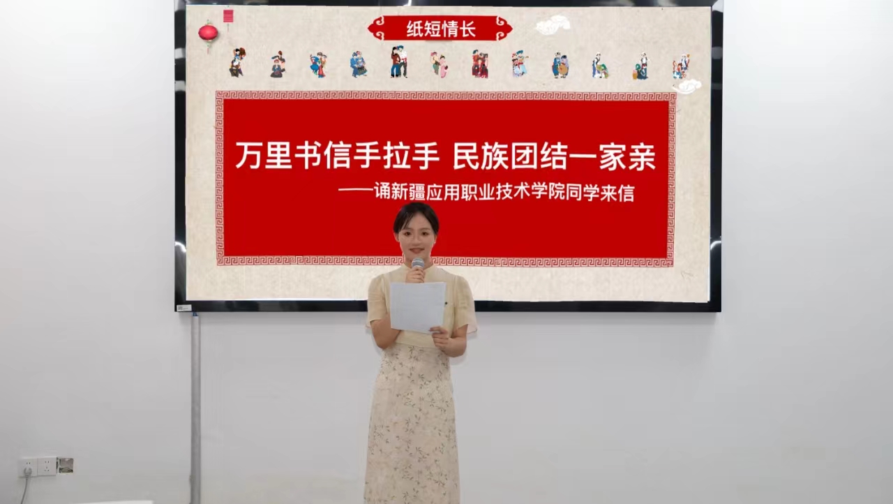 本次主题活动共分为“经典诵读、同心讲坛、红色佳话、纸短情长、共沐书香”五个环节。在“经典诵读”环节中,来自藏族的土丹次仁、白族的赵福军同学和金话筒主持团社员们共同演绎了《盛开的民族团结之花》;在“同心讲坛”环节,来自藏族、壮族、回族、彝族、布依族、白族、满族、土家族、哈尼族等9个民族的青年学生代表分别讲述了在中国共产党的领导下,新时代十年以来家乡的发展和变化,表达了自己坚定“听党话、感党恩、跟党走”,为建设社会主义现代化国家奉献青春力量的信心与决心,同时少数民族同学们亲切地用家乡话向大家问好;在“红色佳话”环节,来自回族的姚兰倩同学为大家深情讲述了总书记讲过的民族团结进步故事“单家集夜话”;在“纸短情长”环节,金话筒主持团社员为大家诵读了近期来自新疆应用职业技术学院同学的来信,与会同学共同感受了“万里书信手拉手 民族团结一家亲”的深厚情谊;在“共沐书香”环节,邵癸、丁钰玲老师为少数民族同学们赠予《红色家书》,与大家“共读一本书 凝聚民族情”。活动期间,少数民族同学们分别围绕学校校园文化活动、生活服务、就业服务、自身权益等方面为促进学校发展建言献策。